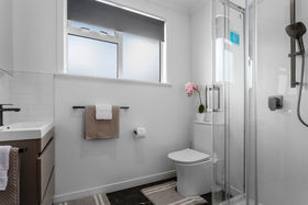 New bathroom with modern shower, vanity and toilet