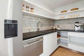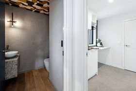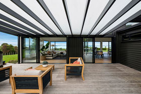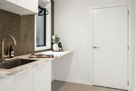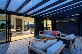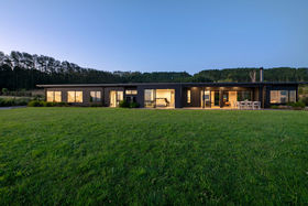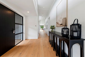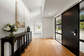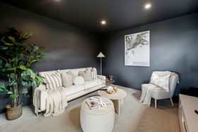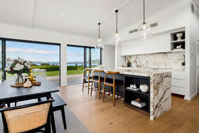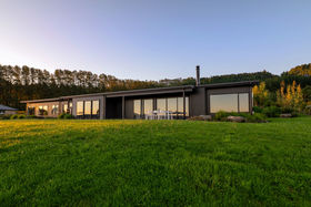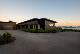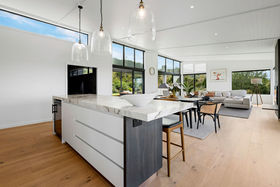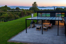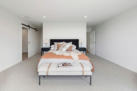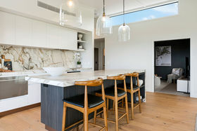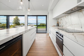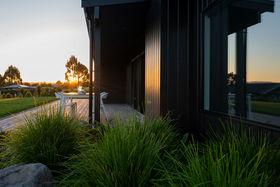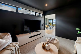 Showcasing contemporary design, the home combines clean lines, dark exterior tones and high-quality finishes. Light-filled interiors feature a fresh white palette, raked ceilings and expansive glazing to frame the stunning lake outlook.